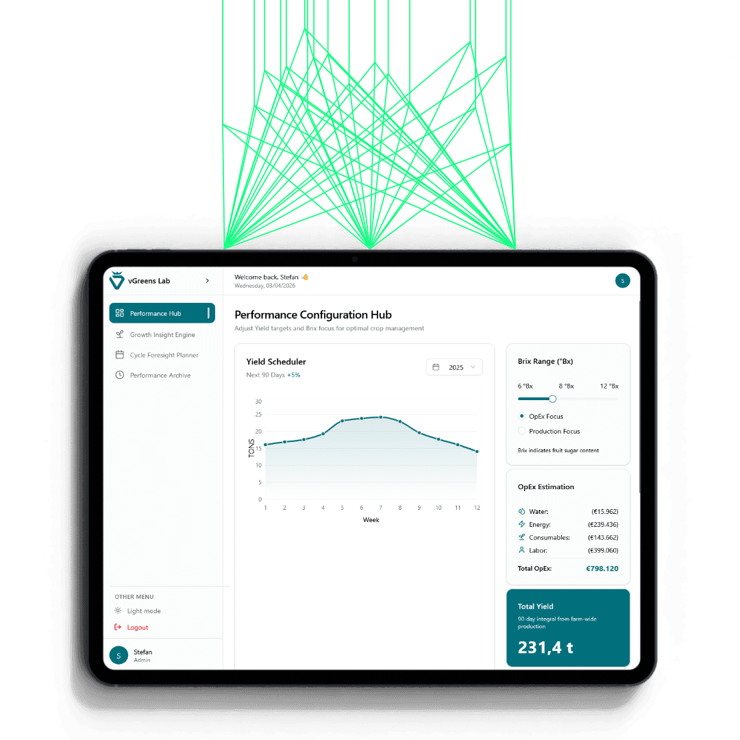vGreens Lab delivers clear recommendations, precise yield predictions, and – where integrated – automated steering of existing climate and irrigation systems.